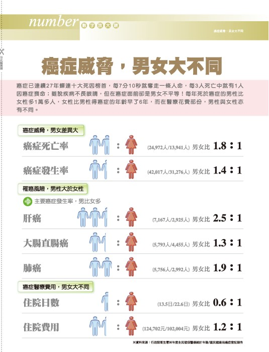 衛生署統計室進一步分析,癌症蟬聯27年國人十大死因之冠,但與去年相較略微下降了0.1%,每十萬人口減少10人,是一項好消息,至於意外事故、慢性疾病包括肝病和肝硬化、腦血管疾病等死亡率都比起前一年下降,在男女部分,除了惡性腫瘤都占死因第一名,女性受肺炎與高血壓、敗血症和糖尿病等疾病威脅增加,男性自殺、慢性肝病和慢性下呼吸道疾病則是比女性來的嚴重。